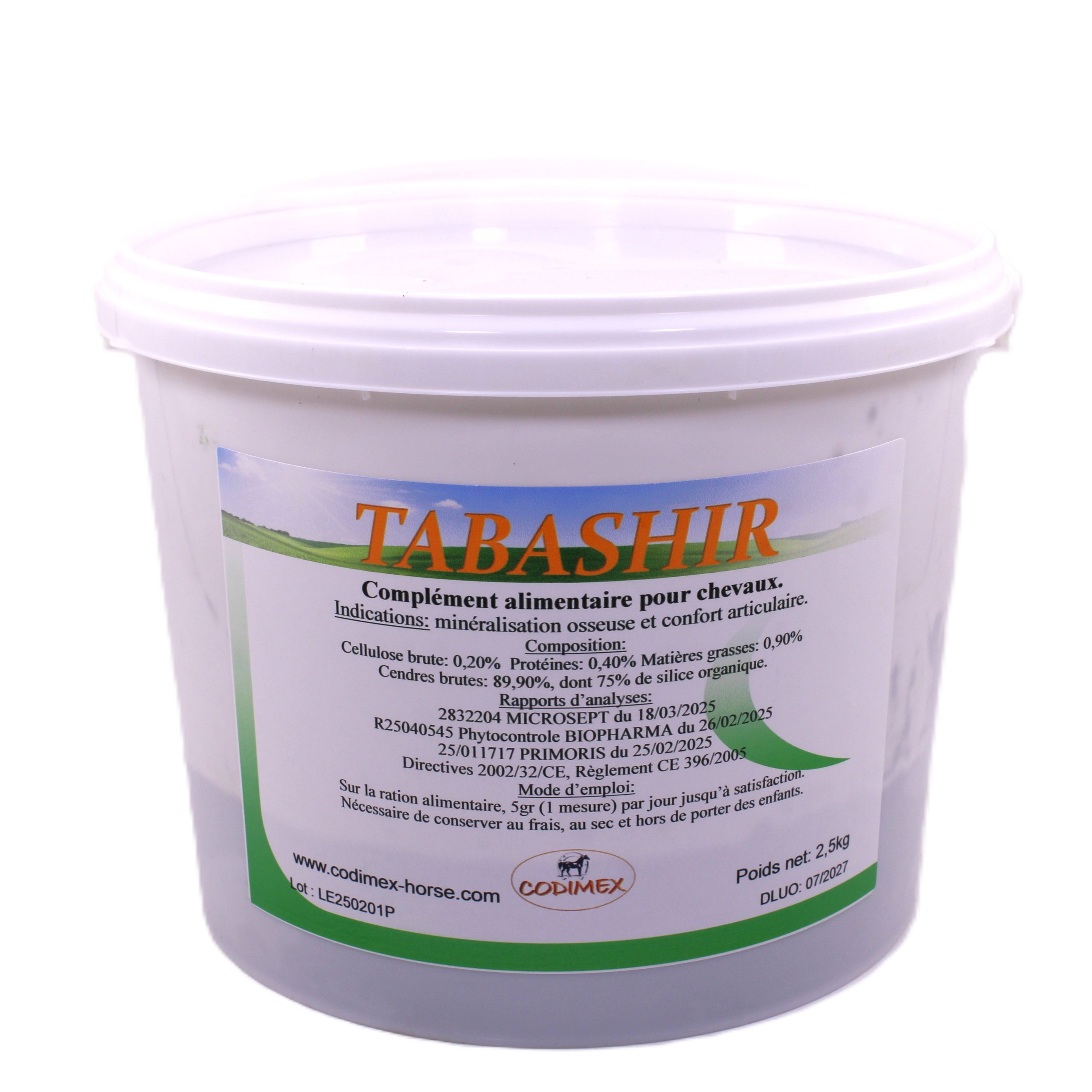 Le TABASHIR est une résine extraite des cavités des tiges de bambou. Au même titre que la prêle, le TABASHIR est une excellente source de silicium organique très assimilable par l’organisme. Sa teneur en silice est de 68%.Le silicium est l’un des composés les plus importants des tissus conjonctifs, tels que les os, les tendons et le cartilage. Par ce fait, le TABASHIR participe à la reminéralisation osseuse et au soutien de la flexibilité, la mobilité et le confort articulaire des chevaux.